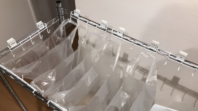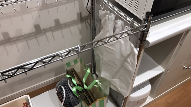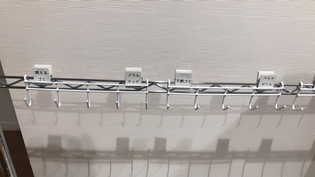 このようにたくさんのビニール袋を引っ掛けることができるので、このスチールラックひとつで楽に分別ができるのだ。