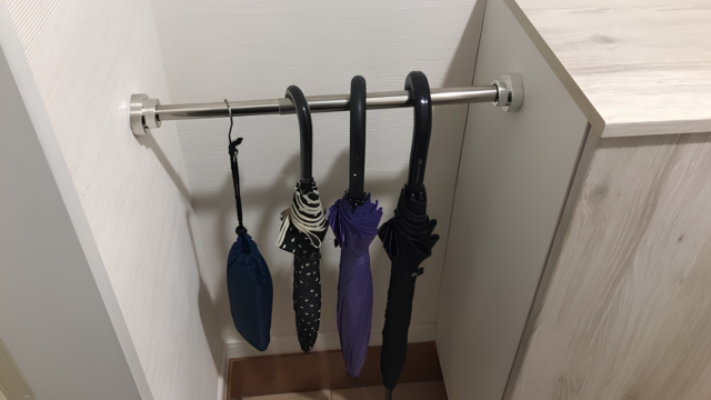シューズボックスと壁の間に突っ張り棒を設置して、そこに傘を掛けるようにしている。